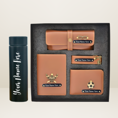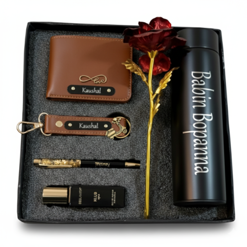 Personalized Gift Hamper -Wallet, Keychain, Eyewear Case, Perfume, Golden Rose, Pen & Personalised Temprature Bottle